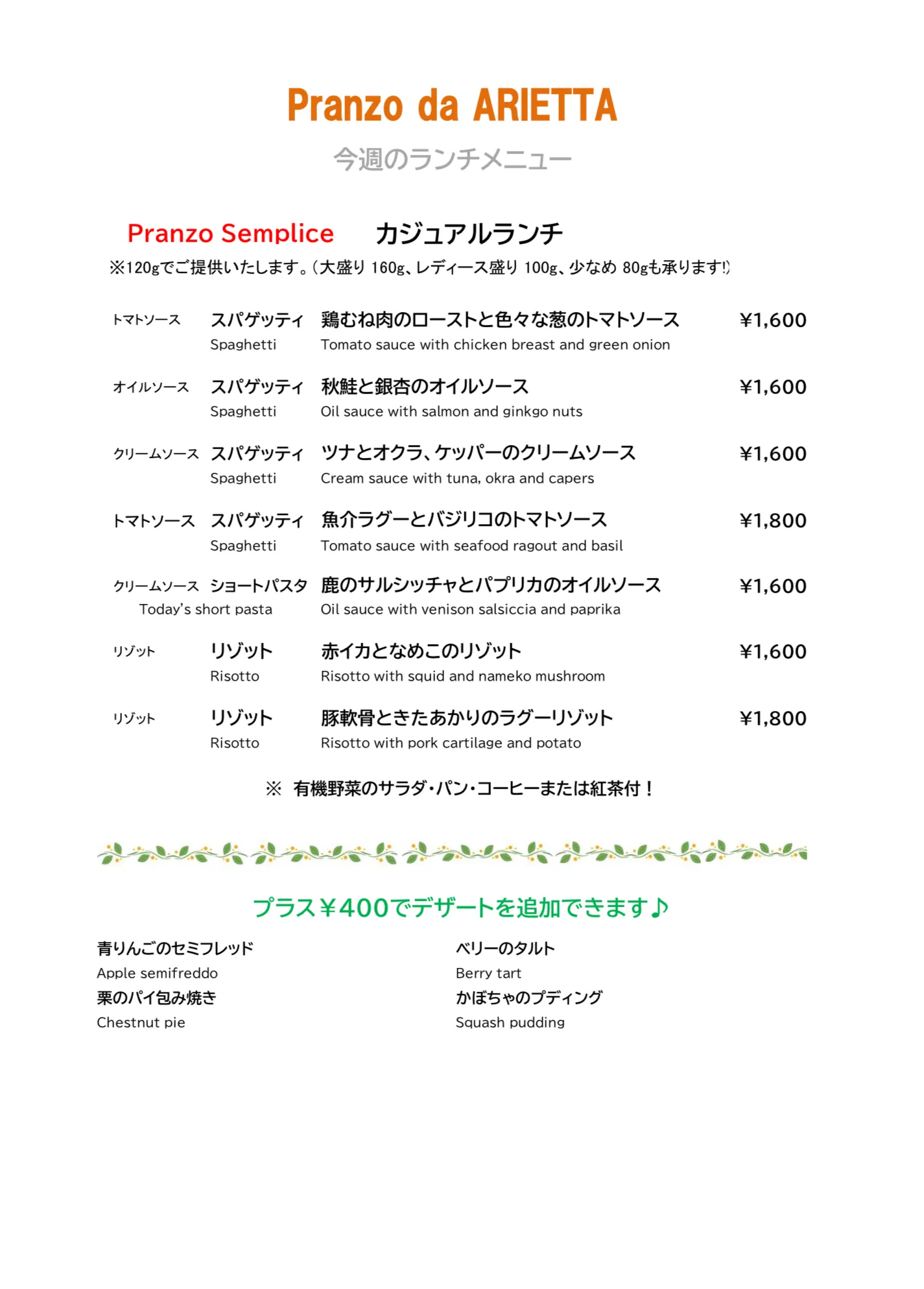 10/14(火)〜のランチメニューです
